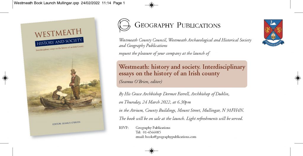 On Thursday next 24 March a major work on the history of Westmeath from pre-historic times up to the present day will be launched by Archbishop Dermot Farrell in the Atrium of the County Buildings in Mullingar at 630pm.